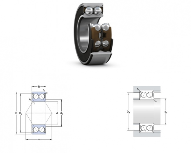 Angular contact ball bearings have inner and outer ring raceways that are displaced relative to each other in the direction of the bearing axis. This means that these bearings are designed to accommodate combined loads, i.e. simultaneously acting radial and axial loads. The axial load carrying capacity of angular contact ball bearings increases as the contact angle increases. The contact angle is defined as the angle between the line joining the points of contact of the ball and the raceways in the radial plane, along which the combined load is transmitted from one raceway to another, and a line perpendicular to the bearing axis.