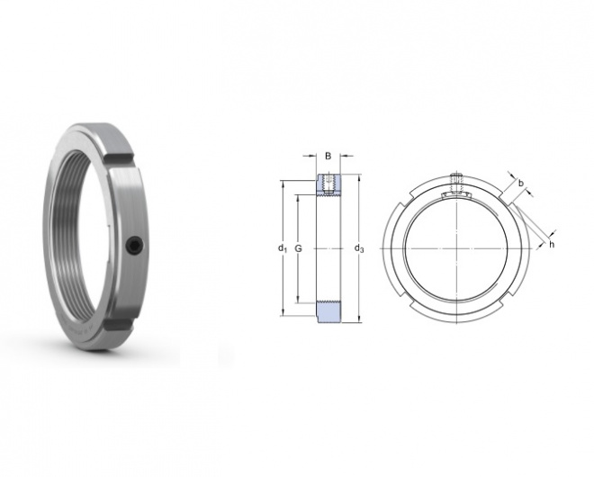 Lock nuts are used to locate bearings onto a shaft. Additionally, they can be used to mount bearings with a tapered bore onto tapered shaft seats and adapter sleeves, and to dismount bearings from withdrawal sleeves. Lock nuts are also frequently used to secure gears, belt pulleys and other machine components. Lock nuts have to be secured to prevent unintentional loosening by: a locking device that engages a keyway in the shaft or key slot in the adapter sleeve, or a locking mechanism integrated in the nut. SKF lock nuts provide a variety of ways to secure the nut onto a shaft. The lock nuts listed here constitute the basic SKF assortment. Lock nuts with other locking methods can be supplied on request. For additional information, contact SKF.