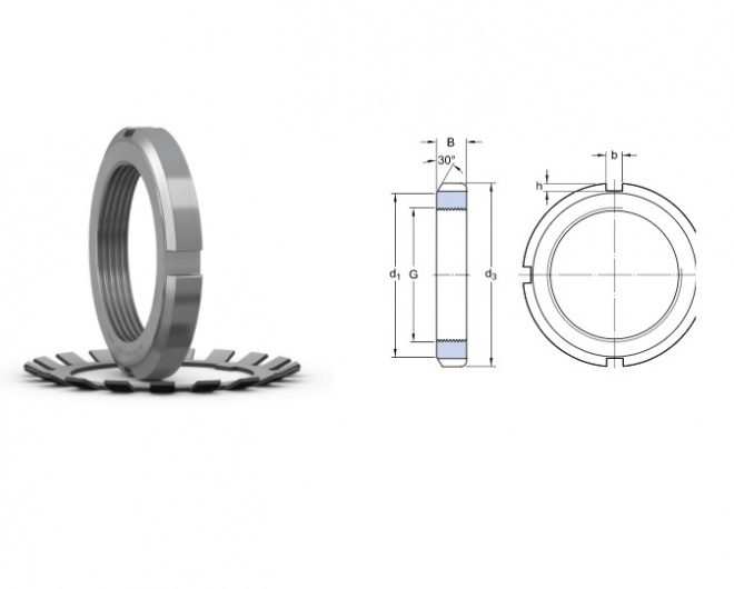 Lock nuts are used to locate bearings onto a shaft. Additionally, they can be used to mount bearings with a tapered bore onto tapered shaft seats and adapter sleeves, and to dismount bearings from withdrawal sleeves. Lock nuts are also frequently used to secure gears, belt pulleys and other machine components. Lock nuts have to be secured to prevent unintentional loosening by: a locking device that engages a keyway in the shaft or key slot in the adapter sleeve, or a locking mechanism integrated in the nut. SKF lock nuts provide a variety of ways to secure the nut onto a shaft. The lock nuts listed here constitute the basic SKF assortment. Lock nuts with other locking methods can be supplied on request. For additional information, contact SKF.
