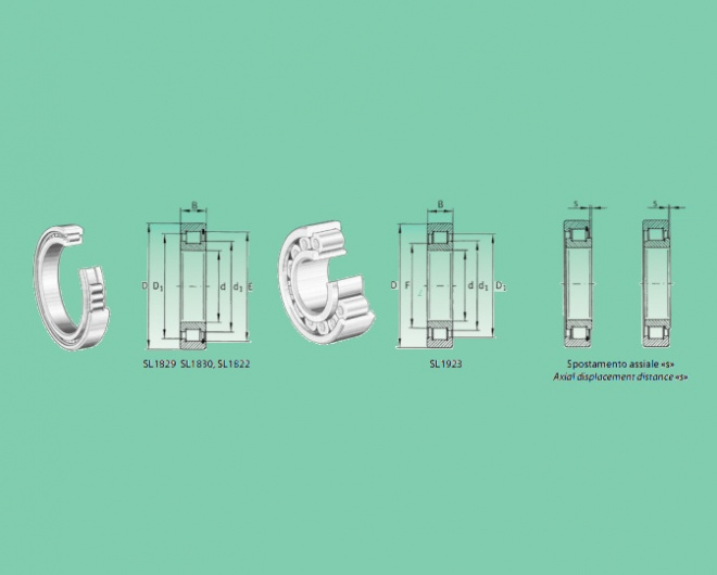 Full complement cylindrical roller bearings are formed by cylindrical rollers, guided on the edge, and by massive inner and outer rings. The great number of rollers can ensure high coefficients of dynamic and static loads. These bearings are particularly suitable where high radial loads and small working places are present. There are different types of full complement cylindrical roller bearings: non-located, semi-located, located, and single and double row. Double row bearings are provided with groove and lubrication holes on the outer ring, as well as seals. The table in page 94, shows the main characteristics of full complement roller bearings.