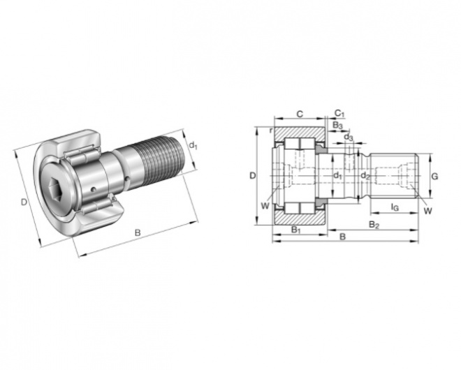 I perni folli appartenenti a questa categoria sono composti da un perno con bordo, un anello esterno con bordi guidato dai rullini, un corpo volvente costituito da rullini a pieno riempimento, tutto questo crea un’ unica unità pronta per il montaggio. La tipologia di questi perni folli garantisce l’assorbimento di carichi elevati, ed anche in virtù della guida assiale presente può sopportare sforzi laterali notevoli. Si ricorda che i perni folli NUKR / PWKR hanno un’ulteriore foro di lubrificazione sul gambo. Se il foro di lubrificazione non dovesse essere utilizzato se ne consiglia la chiusura con apposito tappo. In caso d’utilizzo effettuare frequentemente la lubrificazione.