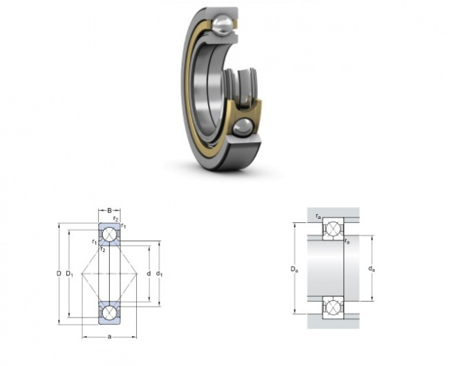 I cuscinetti a sfere a quattro punti di contatto sono cuscinetti radiali obliqui a una corona di sfere con piste concepite per sopportare carichi assiali in entrambe le direzioni. Per un determinato carico assiale, possono sopportare anche un carico radiale limitato (Rapporto di carico). I cuscinetti sono scomponibili, cioè l’anello esterno con il gruppo sfere e gabbia possono essere montati in modo indipendente dalle due metà dell’anello interno.